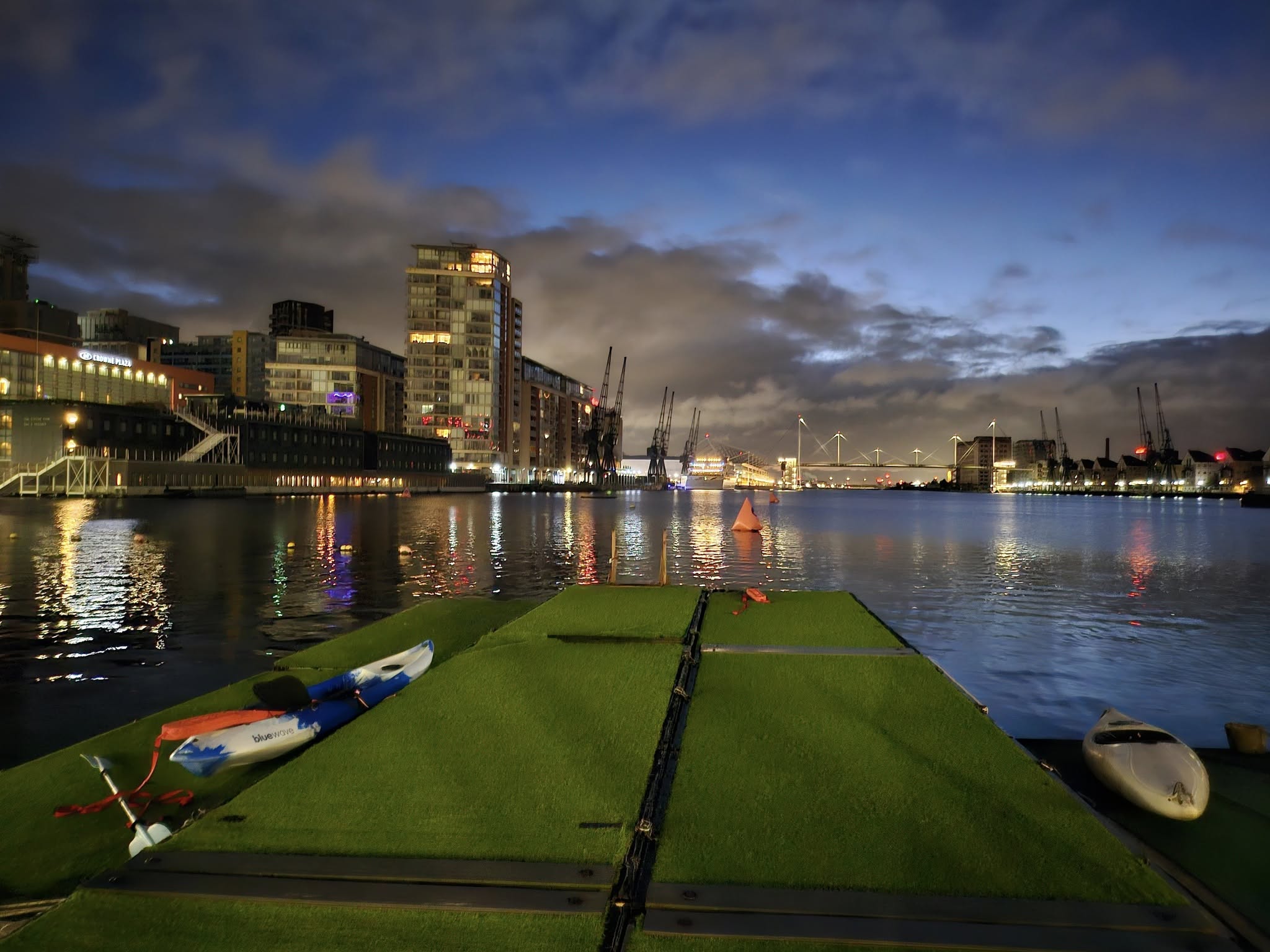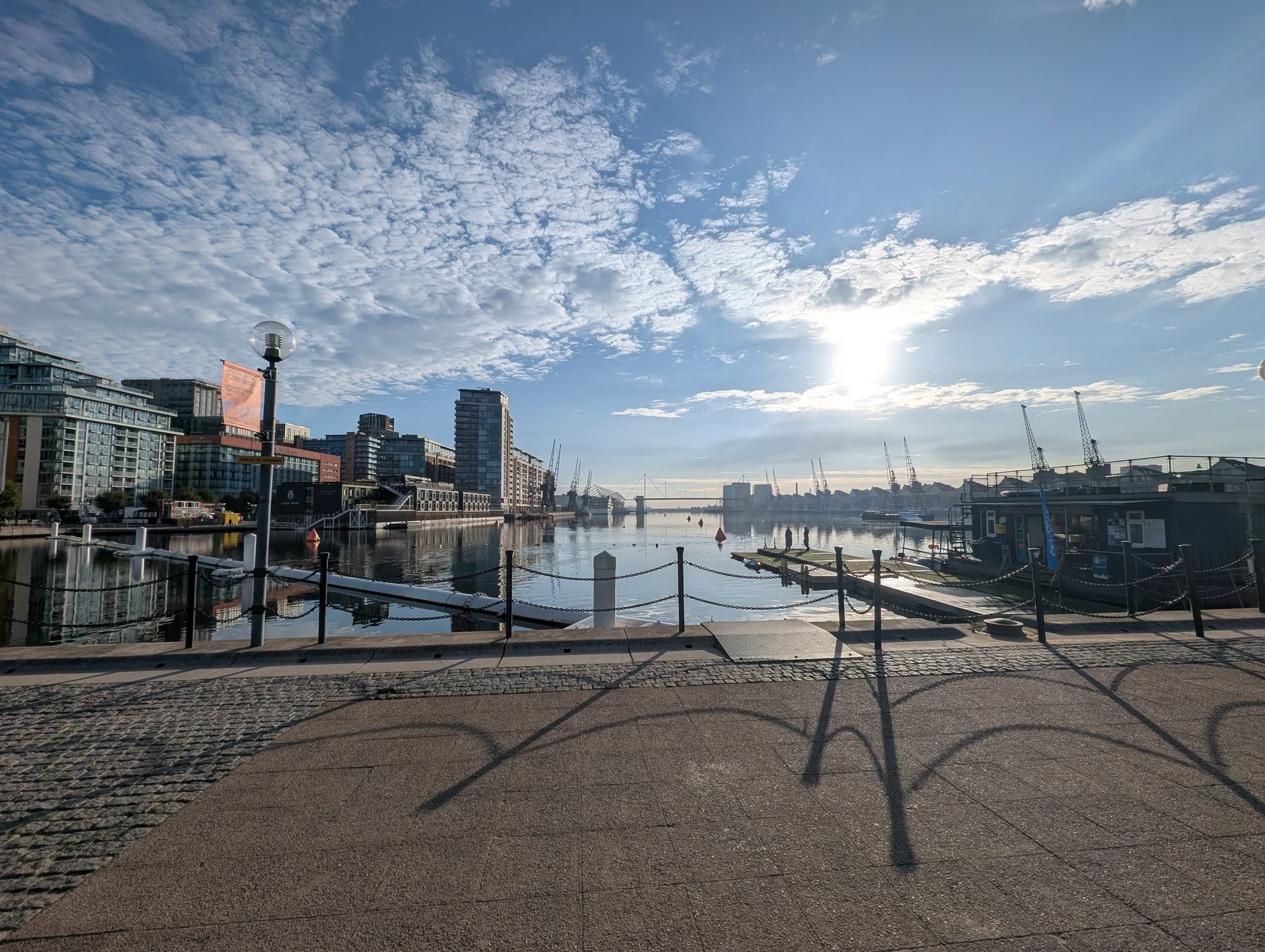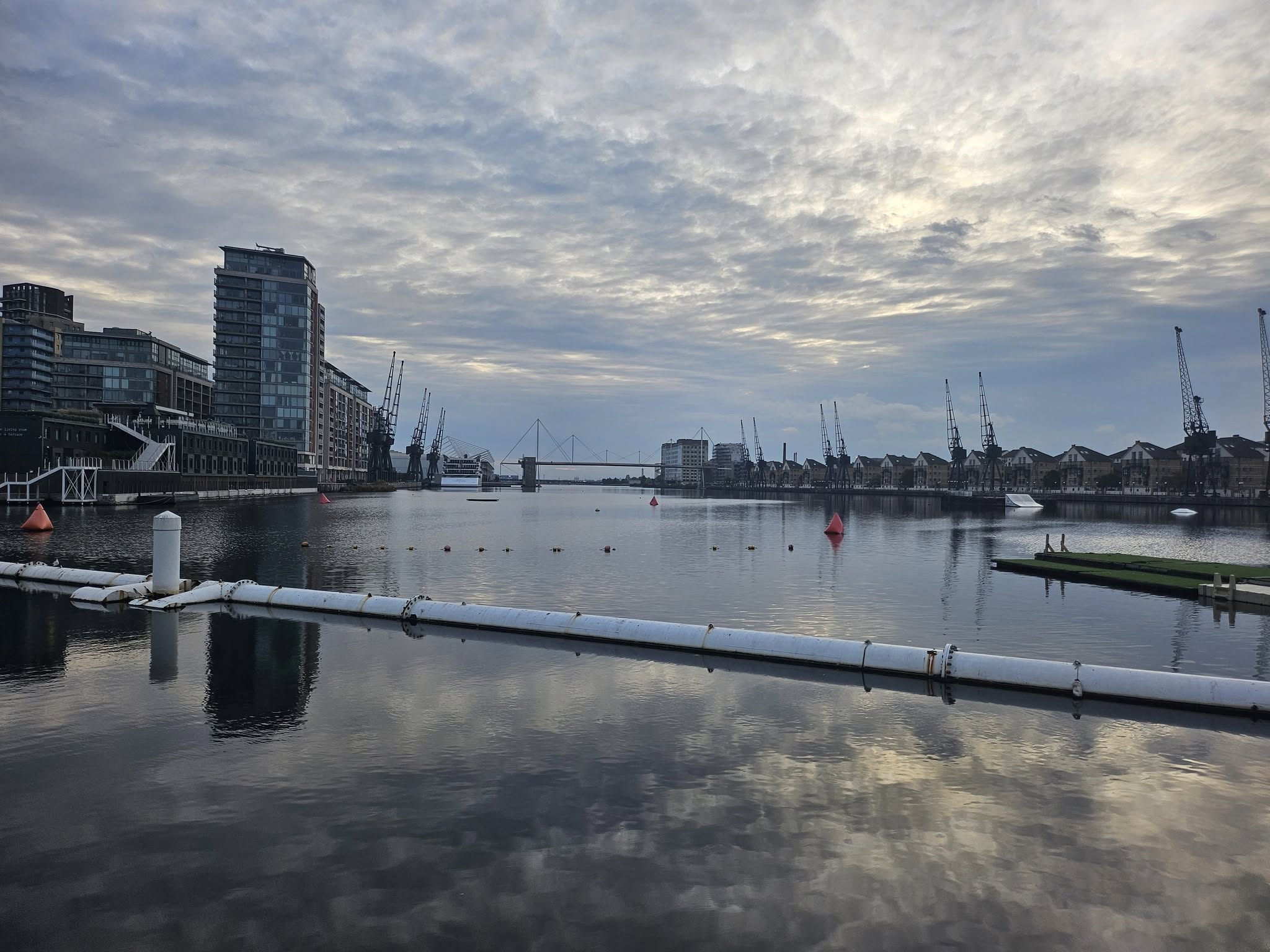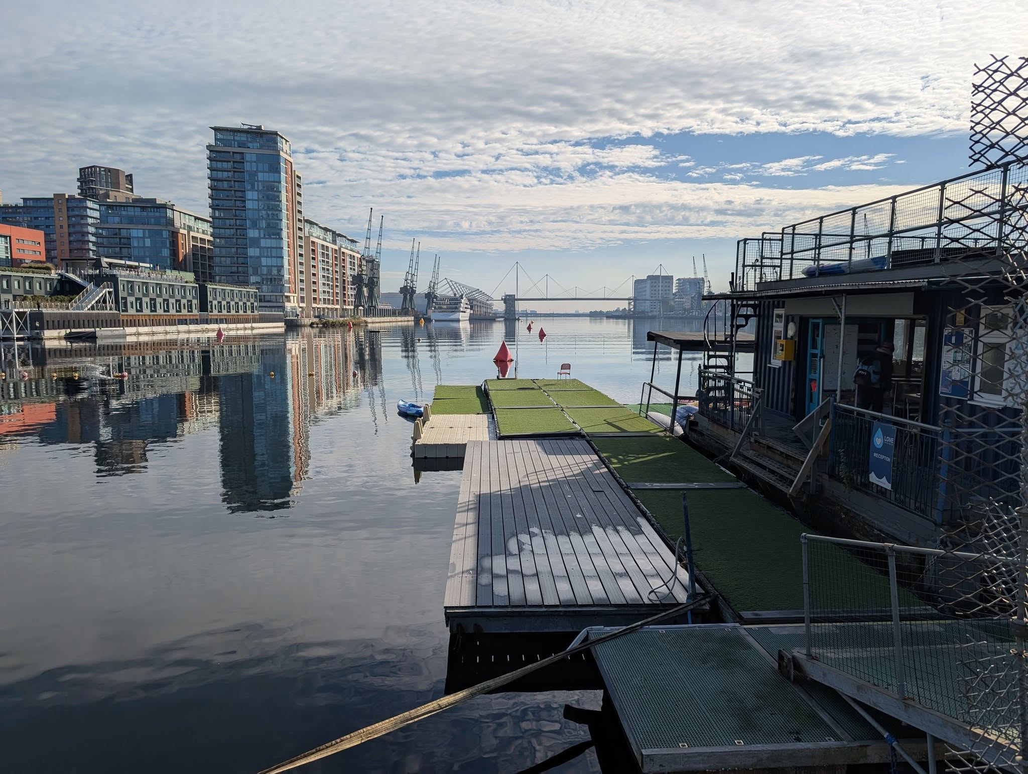 Our open-water swimming venue is set in a dock surrounded by modern buildings and wide, level pathways. The area is spacious, well-lit, and designed to help swimmers and visitors of all abilities feel comfortable and confident. The main access route follows a broad, flat walkway leading down to the pontoons, which provide direct water access.